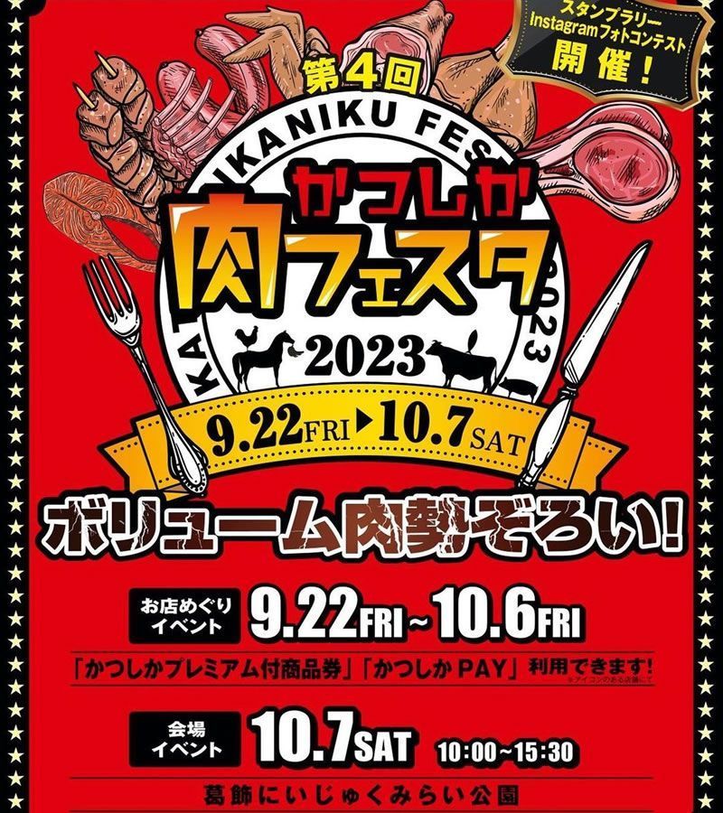10/7(土)東京・金町の葛飾にいじゅくみらい公園で「かつしか肉フェスタ」開催。区内25店舗の自慢の肉グルメをおトクなフェスタ価格で食べ比べ→event-checker.info/katsushik...