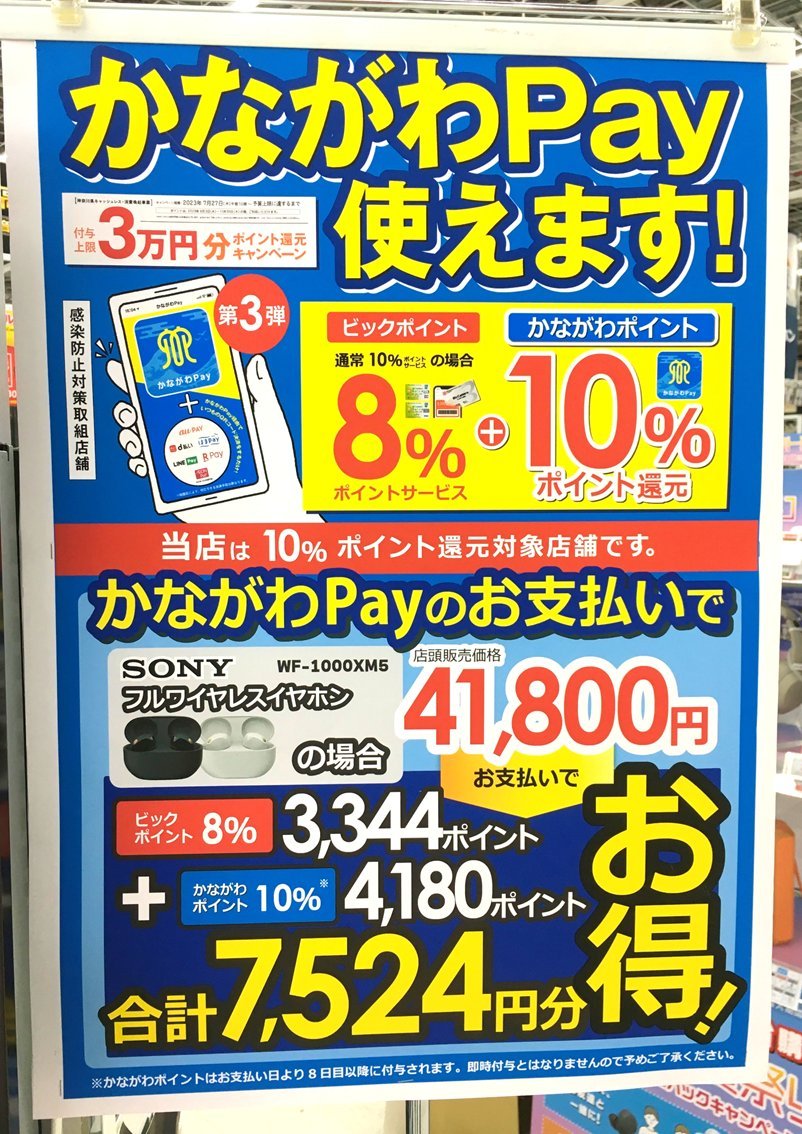 ご予約時全額内金となりますが、当店ラゾーナ川崎、横浜西口店、藤沢店、新横浜店、相模大野駅店、たまプラーザ店の神奈川県内の #ビックカメラ では #かながわPay ご利用いただけます!