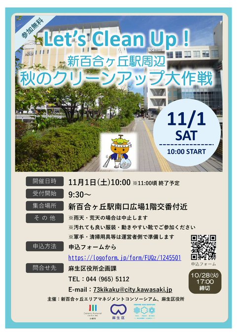 新百合ヶ丘駅周辺クリーンアップ大作戦新百合ヶ丘駅周辺で#清掃活動や#花植えなどを行いますきれいなまちにする活動に参加してみませんか日時:11月1日(土)10時~11時場所:新百合ヶ丘駅南口集合申込み:..