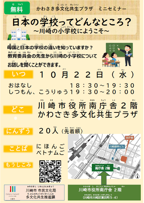 日本の学校ってどんなところ?教育委員会の先生から川崎の小学校についてお話しを聞くことができます。日時10月22日(水)18時30分~20時場所かわさき多文化共生プラザ定員先着20名申込二次元コードド又..