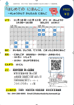 はじめてのにほんご日本語をはじめて勉強する人が買い物、病院、おでかけなど生活でよく使う日本語を学ぶ全10回の講座です。日時11月18日(火)~12月12日(金)14:00~16:00場所高津市民館第4..
