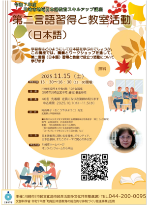 令和7年度地域日本語教育スキルアップ講座第二言語習得の理論や、それに基づいた学習方法、教室で役立つ活動について学ぶ講座です。日時11月15日(土)13時30分~16時30分場所川崎市役所本庁舎1階10..