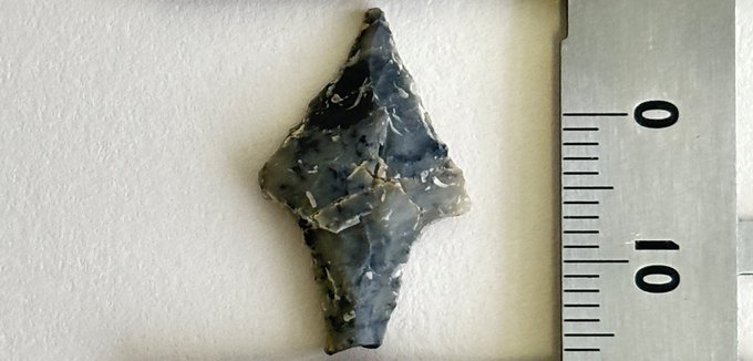 #万福寺遺跡群では、草創期の土器と共に旧石器時代以来の技法で作られた石器、#有舌尖頭器(ユウゼツセントウキ)が出土しています。旧石器時代の尖頭器は鎗先ですが、草創期では多くが小型化し、#石鏃として使..