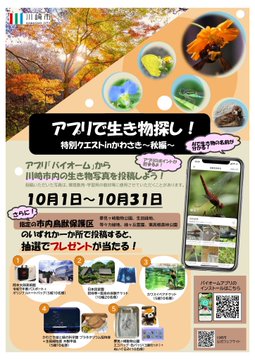 アプリで生き物探し!特別クエストinかわさき~秋編~#バイオームアプリを使って、市内の動植物の写真を募集中AIが生き物の名前を教えてくれます募集期間:10月31日まで条件クリアで、抽選でプレゼント当た..