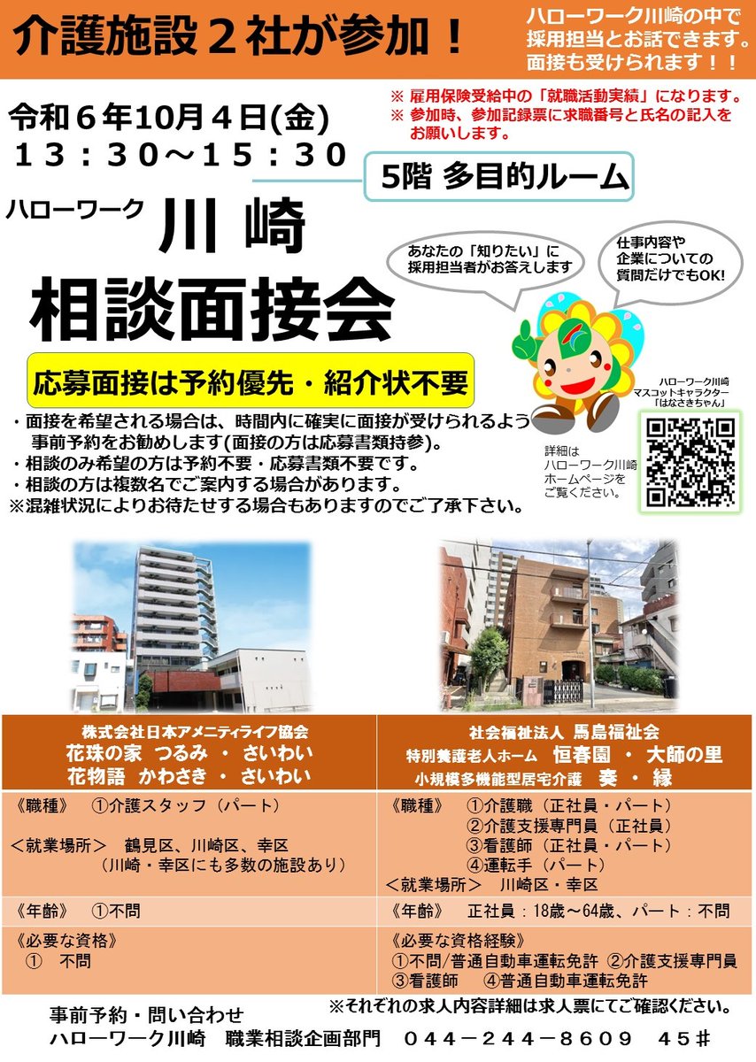 #面接会のご案内です。10月4日13:30~ハローワーク川崎にて開催。#介護施設2社が参加します。#ハローワーク川崎にて事業所の採用担当者とお会いすることができます。相談のみでも参加できます。#介護職..