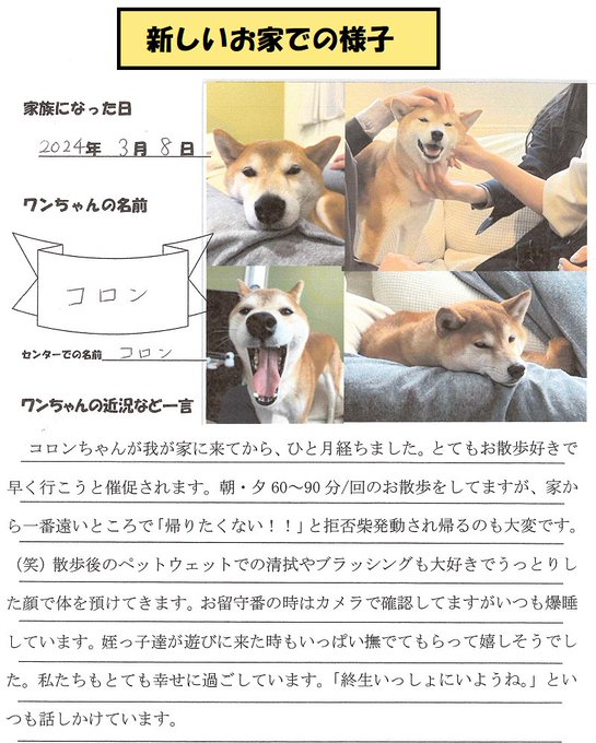 みなさん、こんにちワン! 今日は新しい飼い主さんからのおたよりを紹介するね。 新しい飼い主さん、ありがとう! #保護犬 #新しい飼い主さん決定 #譲渡 #神奈川県動物愛護センター