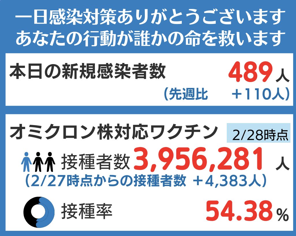 本日の#新型コロナウイルス#新規感染者数等の状況をお知らせします。◆新規感染者数(3/6時点) 259人(先週比-33人)◆オミクロン株対応ワクチン(2/28時点) 接種者数3,956,281人(2/..