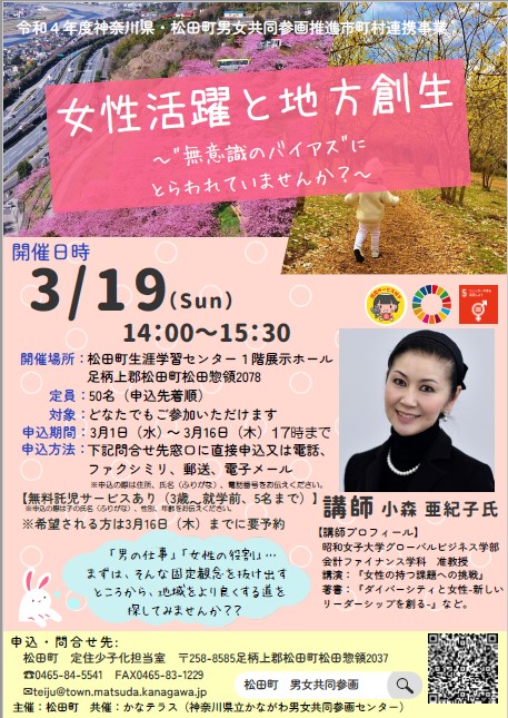 【かなテラスたより】 女性活躍と地方創生~”無意識のバイアス”にとらわれていませんか?~(松田町主催) 「男の仕事」「女性の役割」・・・まずは、そんな固定観念から抜け出し、地域をより良くする道を一緒に探してみませんか?