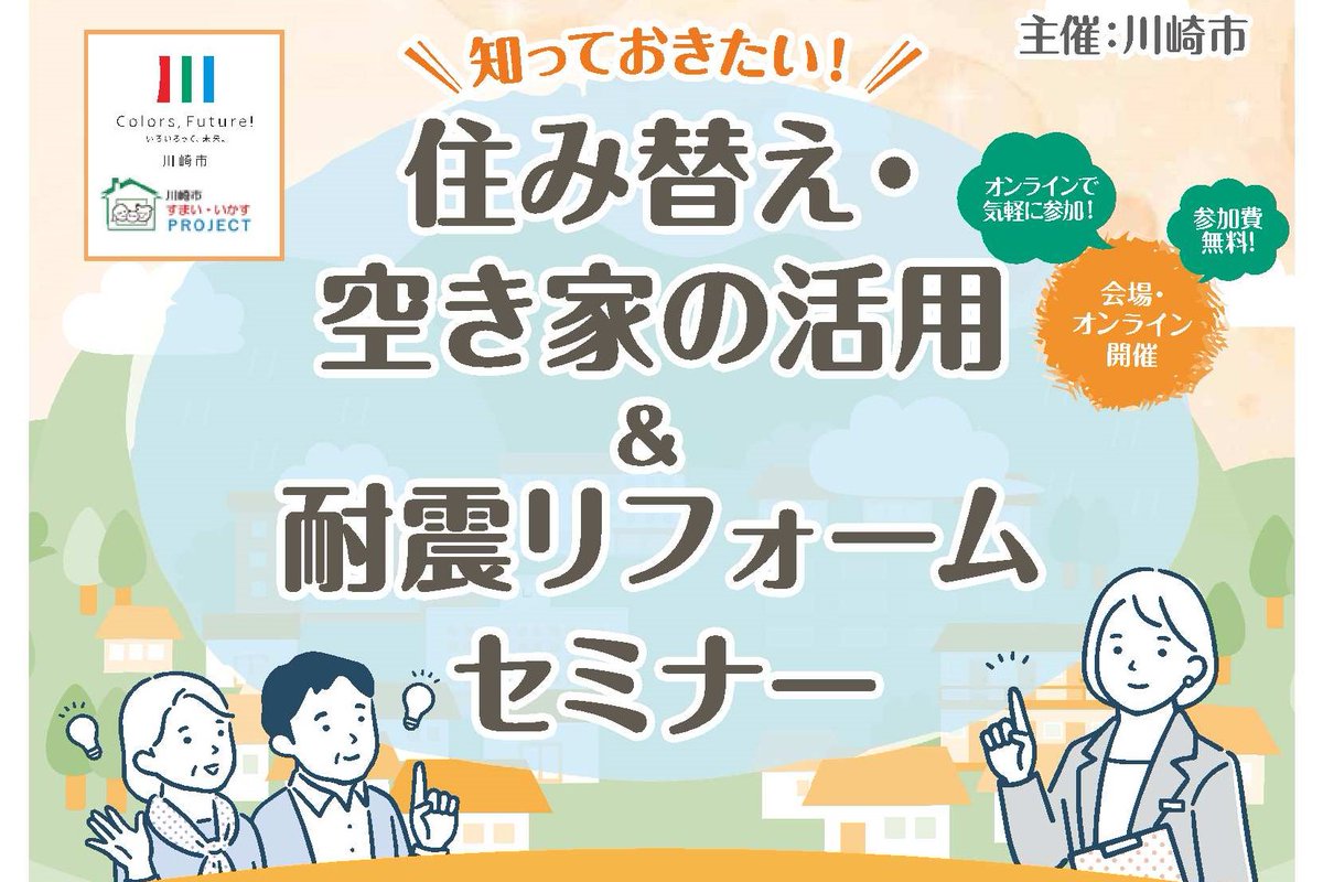 お役立ち情報満載! #川崎市「住み替え・空き家の活用&耐震リフォームセミナー」を開催します 10月12日(日) 14:15~ 中原市民館(WEB受講も可) 先着順なのでお早めに! 詳細 https://city.kawasaki.jp/500/page/0000110041.html… #かわさきいいね #住み替え #空き家 #耐震 #実家 #自宅