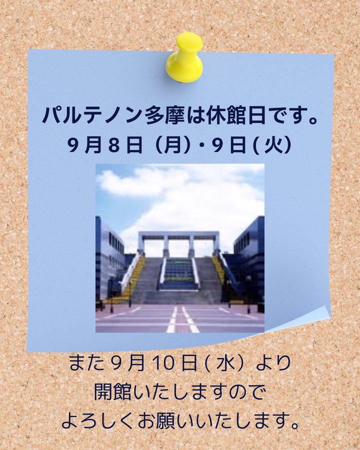 明日9月8日(月)と明後日9月9日(火)はパルテノン多摩は休館日となります。また、9月10日(水)より開館しますので、お間違いなきようよろしくお願いいたします。https://parthenon.or..