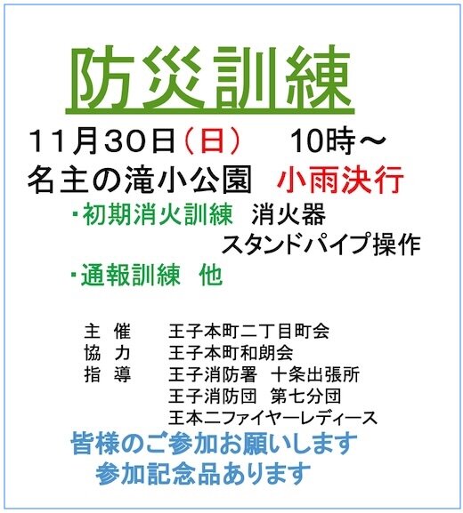 防災訓練 日時:11月30日(日) 10時~ ※小雨決行場所:名主の滝小公園 訓練内容:・初期消火訓練 消火器、スタンドパイプ操作 ・通報訓練 他主催:王子本町二丁目町会協力:王子本町和朗