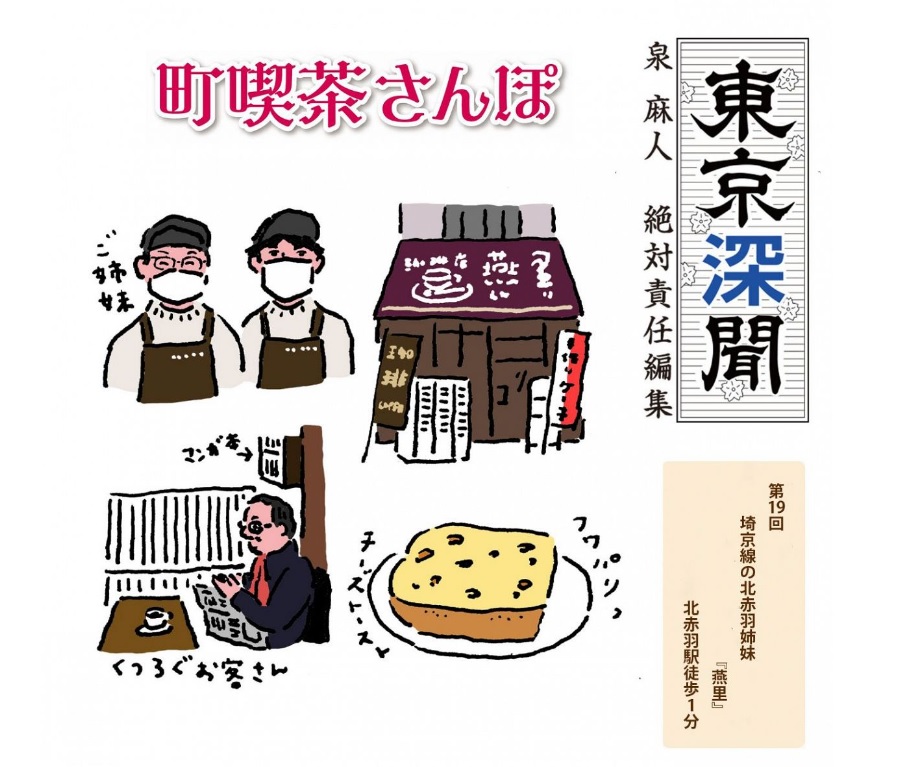 #泉麻人 の東京深聞 を更新しました! 泉麻人さんとイラストレーターのなかむらるみさんが、東京の喫茶店をめぐる街さんぽエッセイ。今回は #埼京線 の北赤羽姉妹『#燕里』。 #北区 #北赤羽 #ぐるり東京 #町喫茶さんぽ #東京新聞