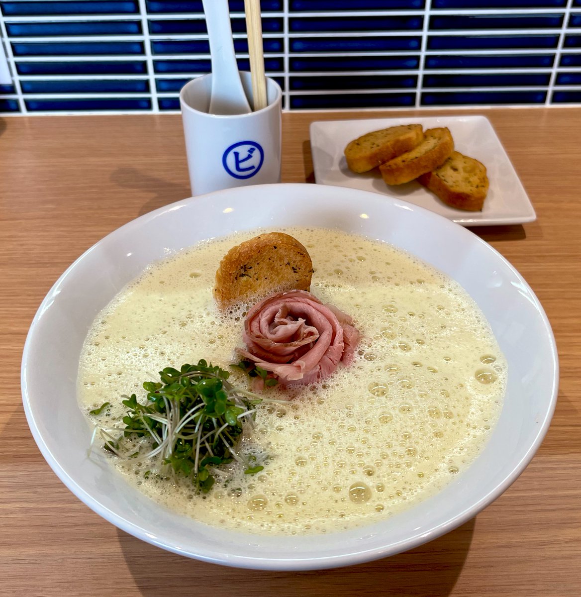 鯛出汁とあさりの旨味がめっちゃ濃厚な平打ち麺のカルボナーラ風🍜✨ラーメンとしての完成度もさる事ながら、このスープとガーリックバターラスクのマリアージュが更なる高みへ誘うメゾン・ド・タマランチと申し上げます‼️🙇♂️💯