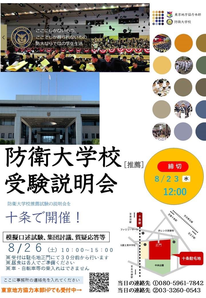 8月26日(土)に #北区十条#防衛大学校 の受験説明会が行われます。是非多くの高校生に参加してもらいたいと思います。防衛大学校は体育会系の人だけ場ではありません。たくさんの知識と技術を身に付けて社会貢献出来る人材育成の場です。ご自身の目で確かめて、将来設計の視野を広げて下さいね。