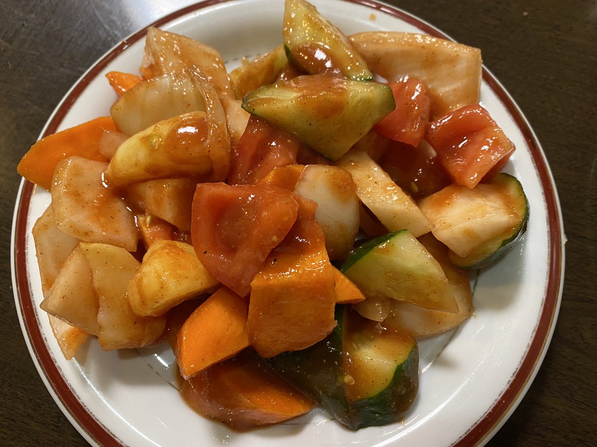 赤羽グレイトカルカッタのトスサラダ。大きくザクギリした野菜に酸っぱ辛いソースが絡む。レモン等の柑橘系香る酸っぱさが心地良い。前に食べた時とレシピが変わったのかな。前のはソース多めで比較的辛いだけだったから、柑橘の香りのある今の方が好きな感じ。