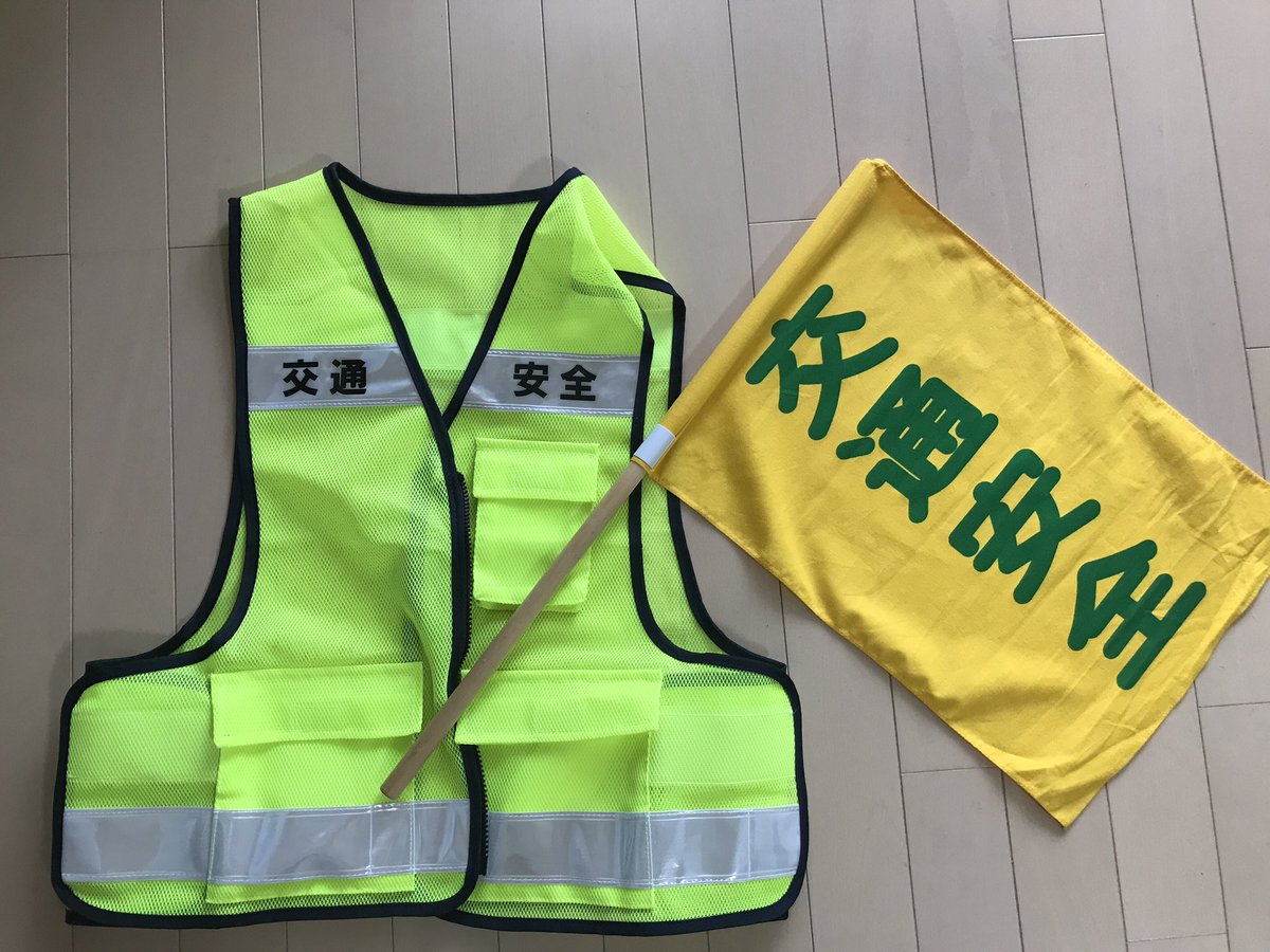 今日は秋の交通安全週間のお手伝いで交差点で旗を振りながら登校の子どもたちを見守り。