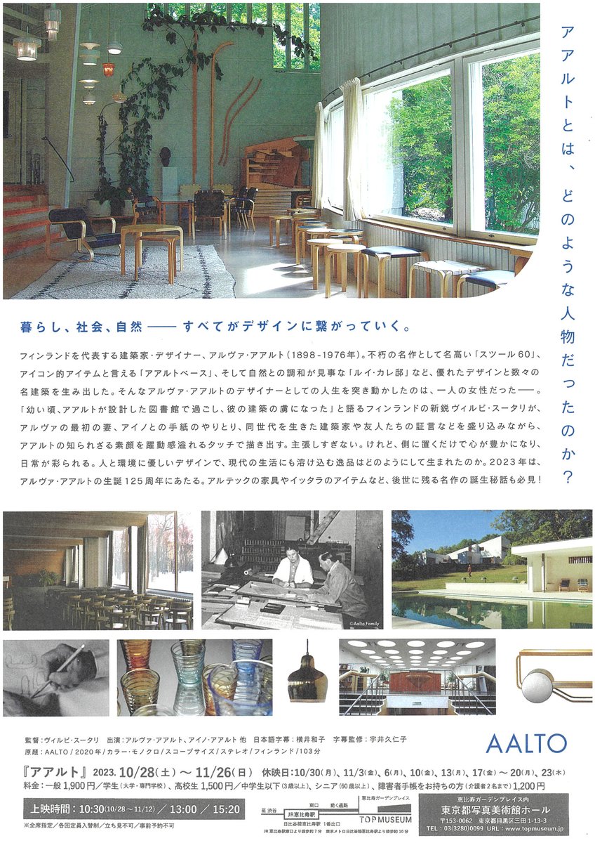 フィンランドを代表する建築家・デザイナーのアルヴァ・アアルト。アアルトの人生を作品とともに巡るドキュメンタリーを上映します。アルテックの家具やイッタラのアイテムなど、後世に残る名作の誕生秘話も必見です。 topmuseum.jp/contents/exhibi..