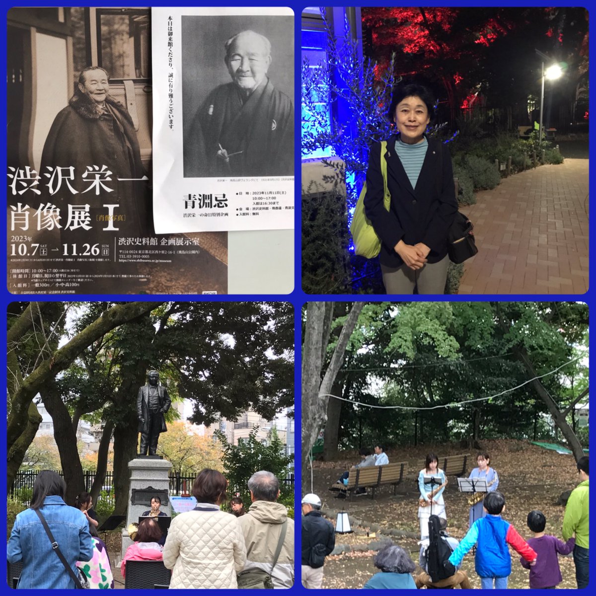 渋沢栄一翁命日 #青淵忌 渋沢翁が居を構えた #飛鳥山 では 日中は入館無料の渋沢史料館や青淵文庫を訪れたり、栄一像や青淵文庫等前でのミニコンサートに耳を傾ける人々。 夜は藍の栽培をしていた渋沢の生家の生業にちなみ、藍色にライトアップ。紅葉ライトアップと共に秋の公園を彩っていました。