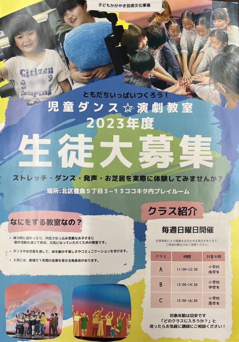 北区つかこうへい劇団が前身のNPO法人★☆北区AKT STAGEさんが運営されてる児童ダンス・演劇教室。