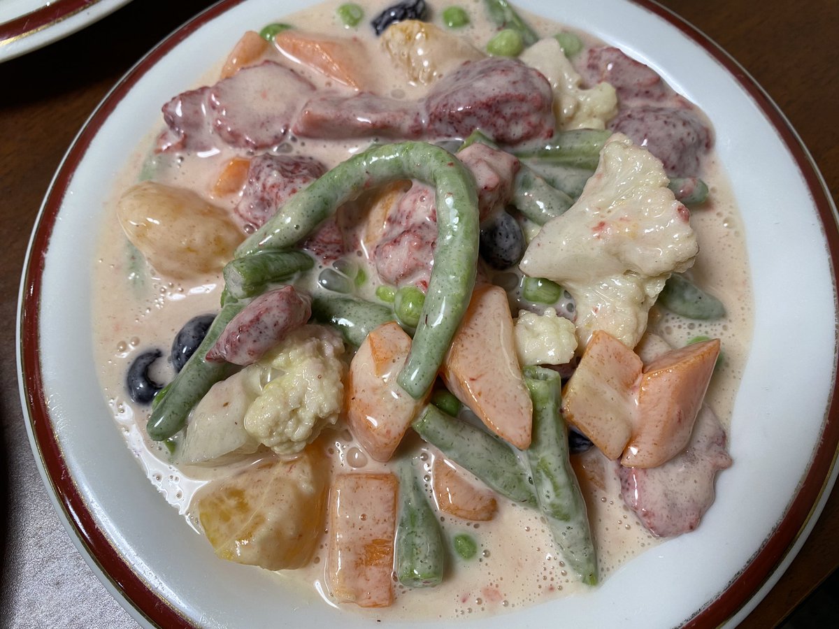 赤羽グレイトカルカッタでロシアンサラダ。今日のはすごくピンク色してるΣ(・□・;)と思ったらいちご🍓が入ってる。ヨーグルトが絡んで見た目じゃわからないという入ってる材料がもはやロシアンルーレット。酸味と甘味が絶妙なバランスで美味しいし楽しい(*´꒳`*)
