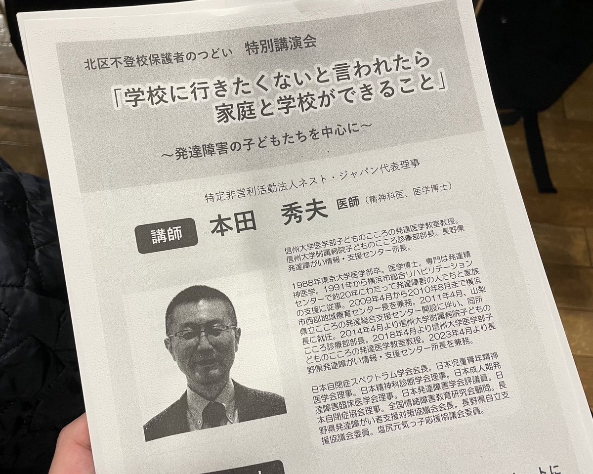 その後、同じく北とぴあで開催された「北区不登校保護者のつどい」特別講演会へ。