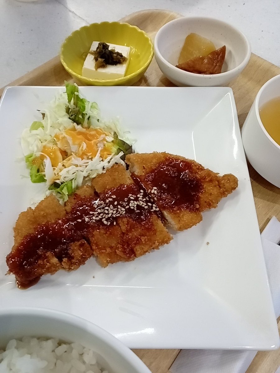 おはようございます☀️🙋♀️本日の日替わりランチとミニデザートは、三元豚の味噌カツと桃のムースです🥰丁寧に衣をつけてサクッと揚げ、特製の味噌ダレをかけました🐖💨💨桃のムースは中にも上にも桃がゴロゴロ🍑食感をお楽しみください🙌 #日替わりランチ #十条