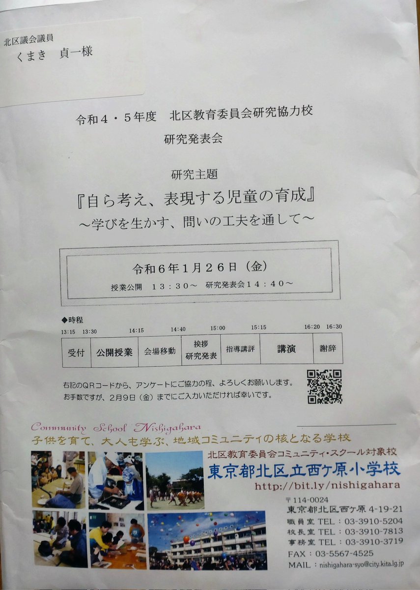 昨日は、地元西ヶ原小学校の研究発表会に行かせて頂きました。各学年、国語か社会で「自ら考え、表現する児童の育成」〜学びを生かす、問いの工夫を通して〜をテーマに授業。先生方の工夫溢れる授業で児童の皆さんが積極的に意見を述べていて頼もしく感じました。