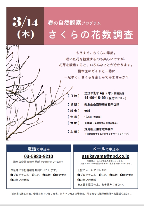 昨年も実施いたしました、春の自然観察プログラム「さくらの花数調査」の参加者を募集いたします。 詳細はHP、ポスターをご参照下さい。www.npd.jp/asukayamapark/pos..