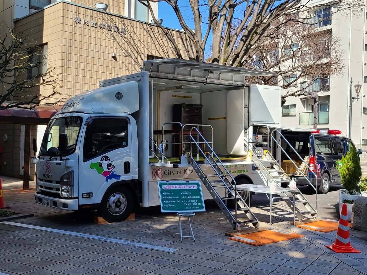 写真は昨日区役所前に設置された起震車です。