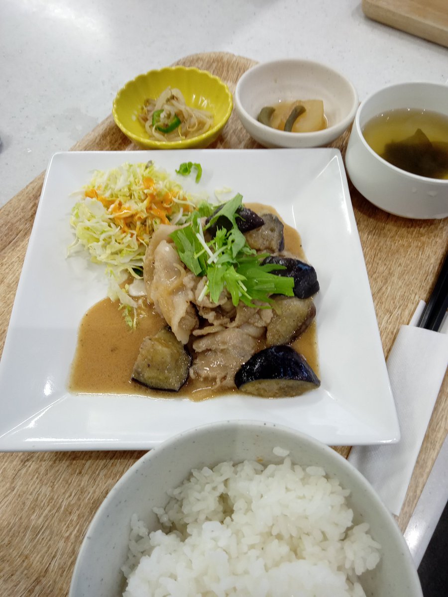 本日の日替わりメニューは豚肉とナスの生姜焼きです🍆🐷豚バラ肉とナスを照り良く生姜醤油ダレで炒めました。ご飯にぴったりなお料理です!