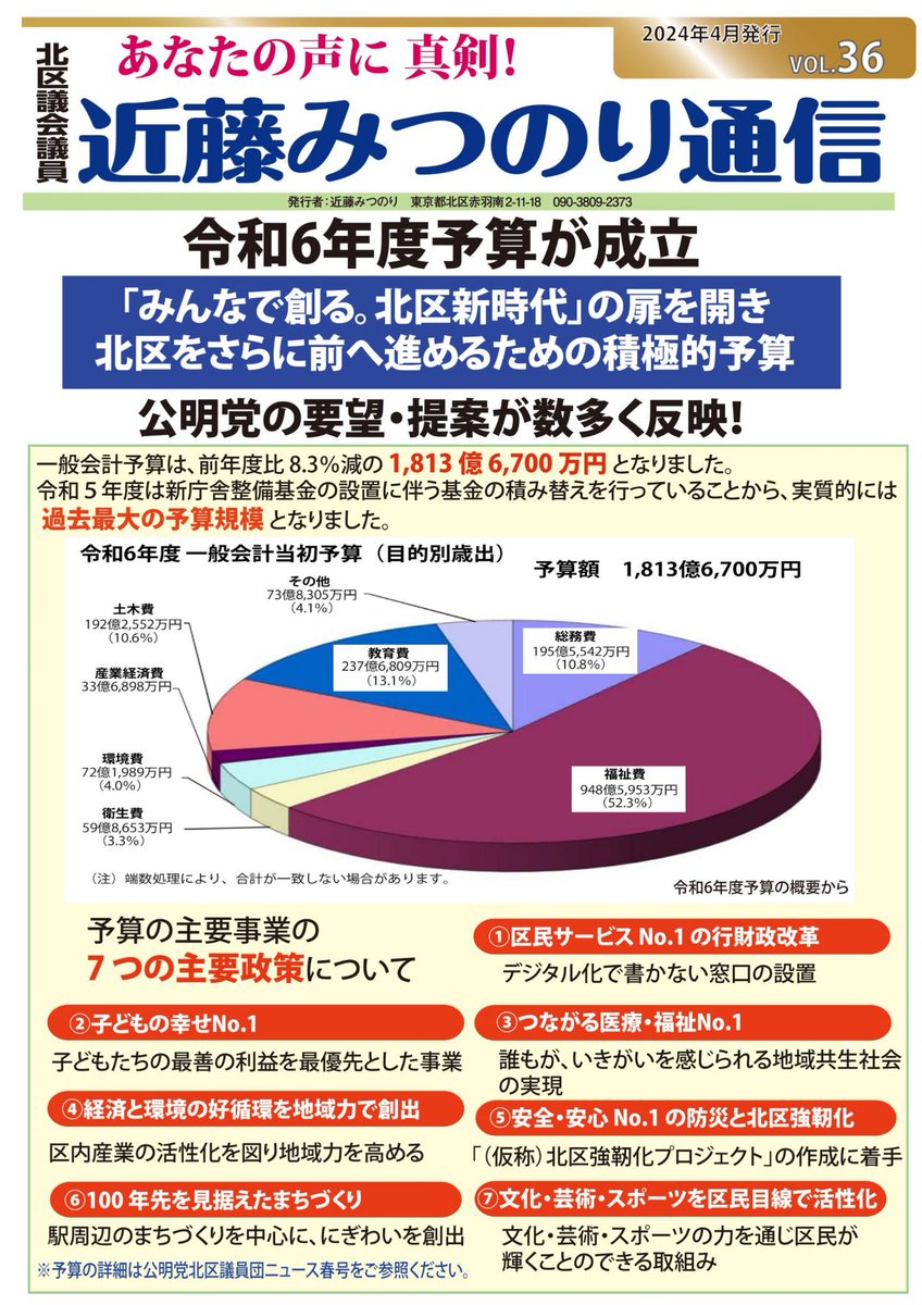 「みんなで創る北区新時代の扉を開く」積極的な予算が組まれ公明党の提案要望が数多く取り入れられた予算となっています。