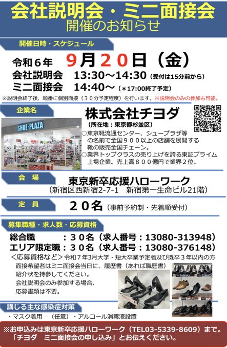 イベントのお知らせ 9月20日(金)13:30〜 【(株)チヨダ】 東京靴流通センター、シュープラザ等の名前で全国900以上の店舗を展開する 靴の販売全国チェーン 業界トップクラスの売り上げを誇る東証プライム上場企業。売上高800億円で業界2位 #就活 #25卒