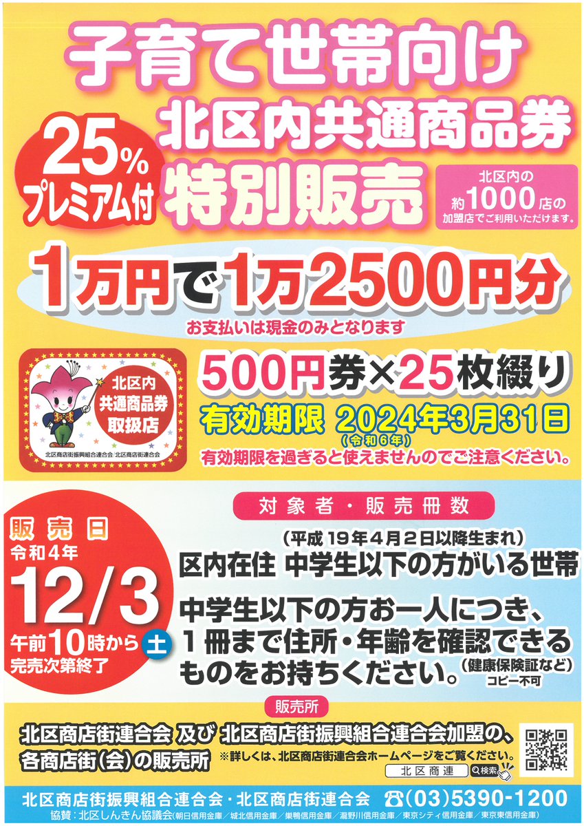 明後日12月3日は、「子育て世帯向け北区内共通商品券特別販売」です。なんと25%のプレミアム付き。1万円で1万2500円分の商品券が購入できます。対象は、北区内在住の中学生以下の方がいる世帯。中学生以..