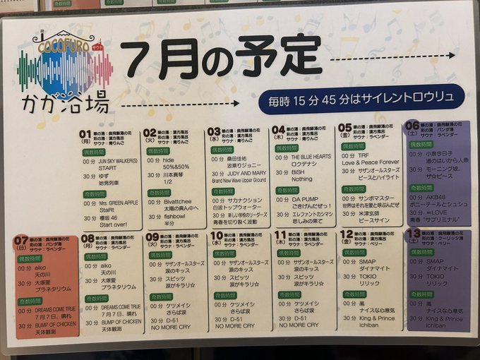 華の湯:奥飛騨湯の花彩の湯:パンダ湯サウナ:ラベンダー[偶数時間]00分aiko/天の川30分大塚愛/プラネタリウム[奇数時間]00分DREAMSCOMETRUE/7月7日、晴れ30分BUMPOFCH..