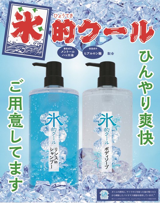この暑い時期に 「氷的クール」ボディーソープとリンスインシャンプーをご用意しました! まずは洗体、サウナからの水風呂 そして風呂上り直前に「氷的クール」でもう一度洗体!! これが お勧めですよ~