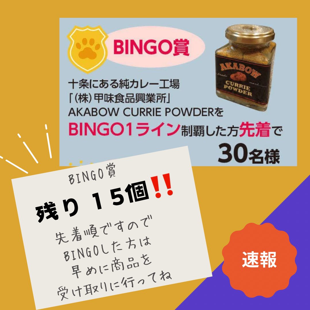 #十条カレー#うますぎカレー伝説今年のBINGO賞、残り15個昨年同様、(株)甲味食品興業所さまより協賛いただいたAKABOWCURRIEPOWDERを先着30名様にご用意しております。BINGO賞の..