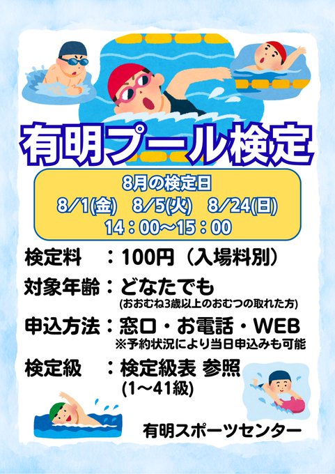 【有明プール検定 開催中】 有明スポーツセンターでは 毎月、プール検定を開催しています! 初心者から上級者まで 難易度別に検定級があるので 気軽にチャレンジできます 大人も子供もぜひ! みなさまの挑戦をお待ちしています! #有明スポーツセンター