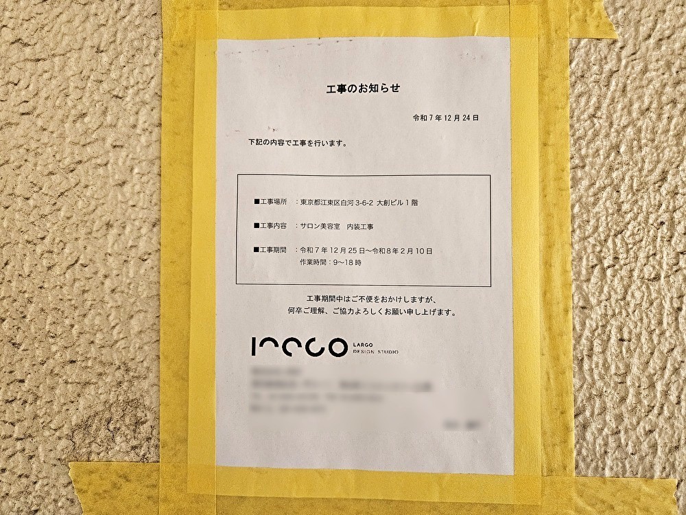 白河3丁目に「サロン美容室」の内装工事のお知らせの張り紙がありました。