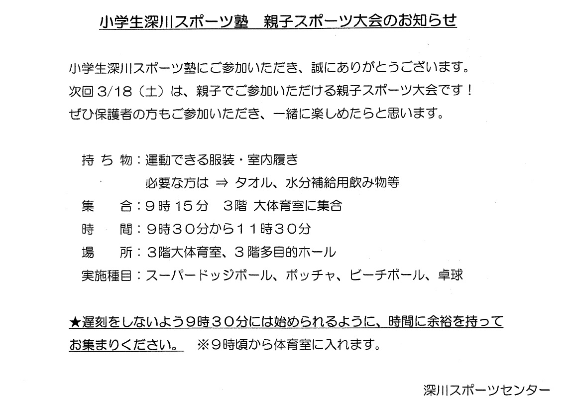 3/18(土)最終日は、親子で楽しめるスポーツ大会です。ぜひ、ご参加ください。