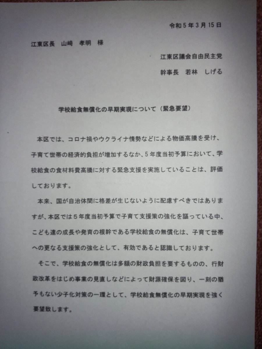一方、都内7区が次年度完全無償化の実施予定のため、我々自民党会派から昨日の本会議後、完全無償化の早期実現の緊急要望を区長に手交いたしました。