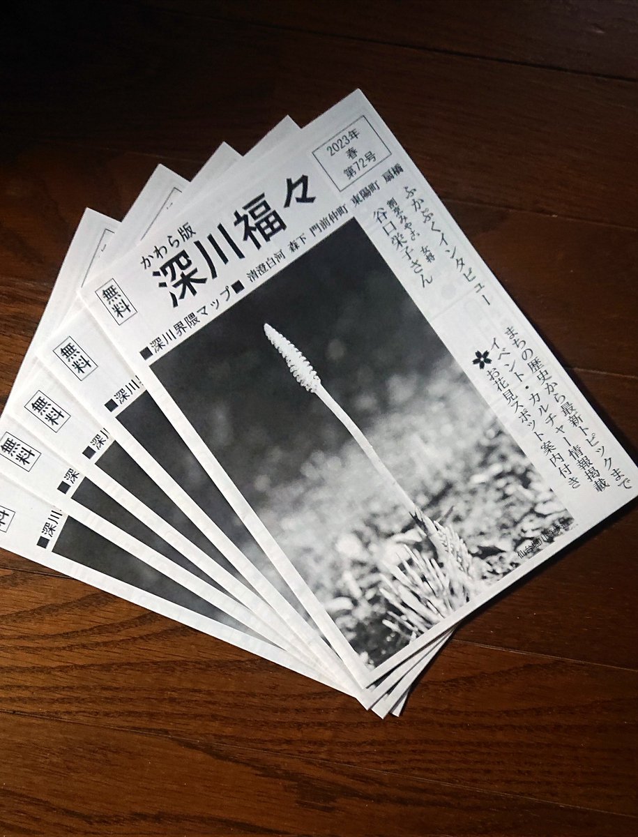 フリーペーパー「かわら版 深川福々」第72号(春号)が発行となりました。深川の店舗や大江戸線清澄白河駅改札内、深川東京モダン館など50ヶ所以上に配布、設置します。まち歩きにぴったりな深川界隈マップ付き。ぜひお持ち帰りください!