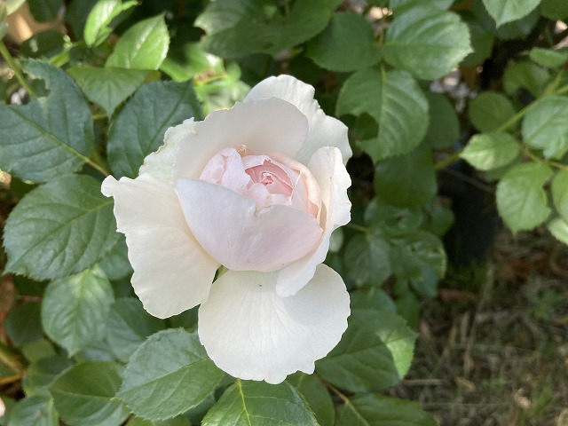 花は周囲が白で中心が淡いピンク色で、繊細な雰囲気のカップ咲きです。房になってゆっくりと開花し、レモンを思わせる香りの強いつるバラです。
