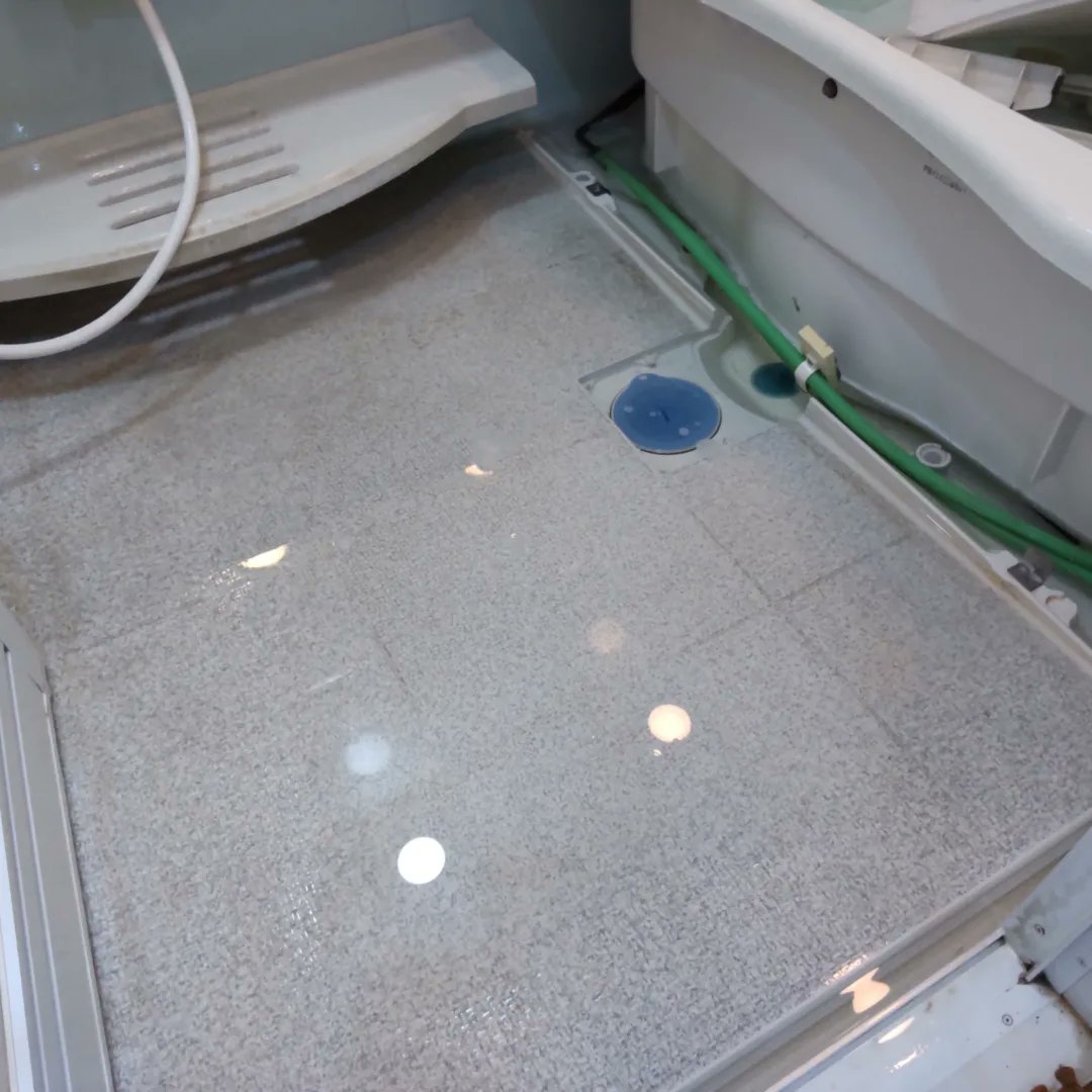 ガラス面を専用クリーナーでピカピカに磨き、エプロンを外してカビキラーをまいて、床面は排水溝をせき止めて洗濯槽クリーナーで浸けおき洗い🙌