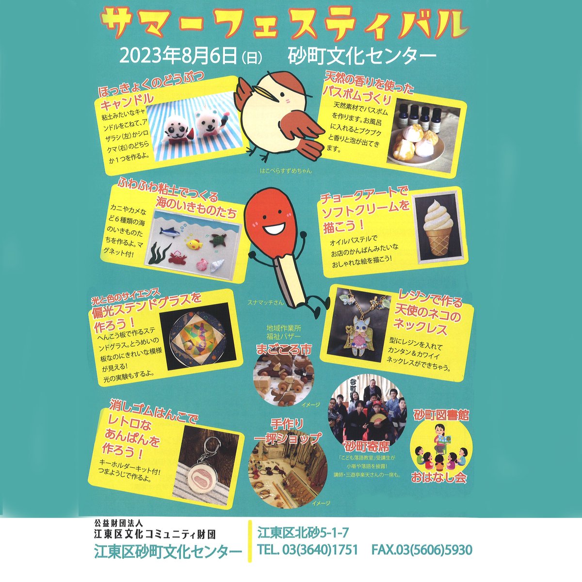たくさんのお店が手作り作品を出品する一坪ショップ、地域作業所福祉バザー「まごころ市」、砂町図書館「おはなし会」などを実施します。