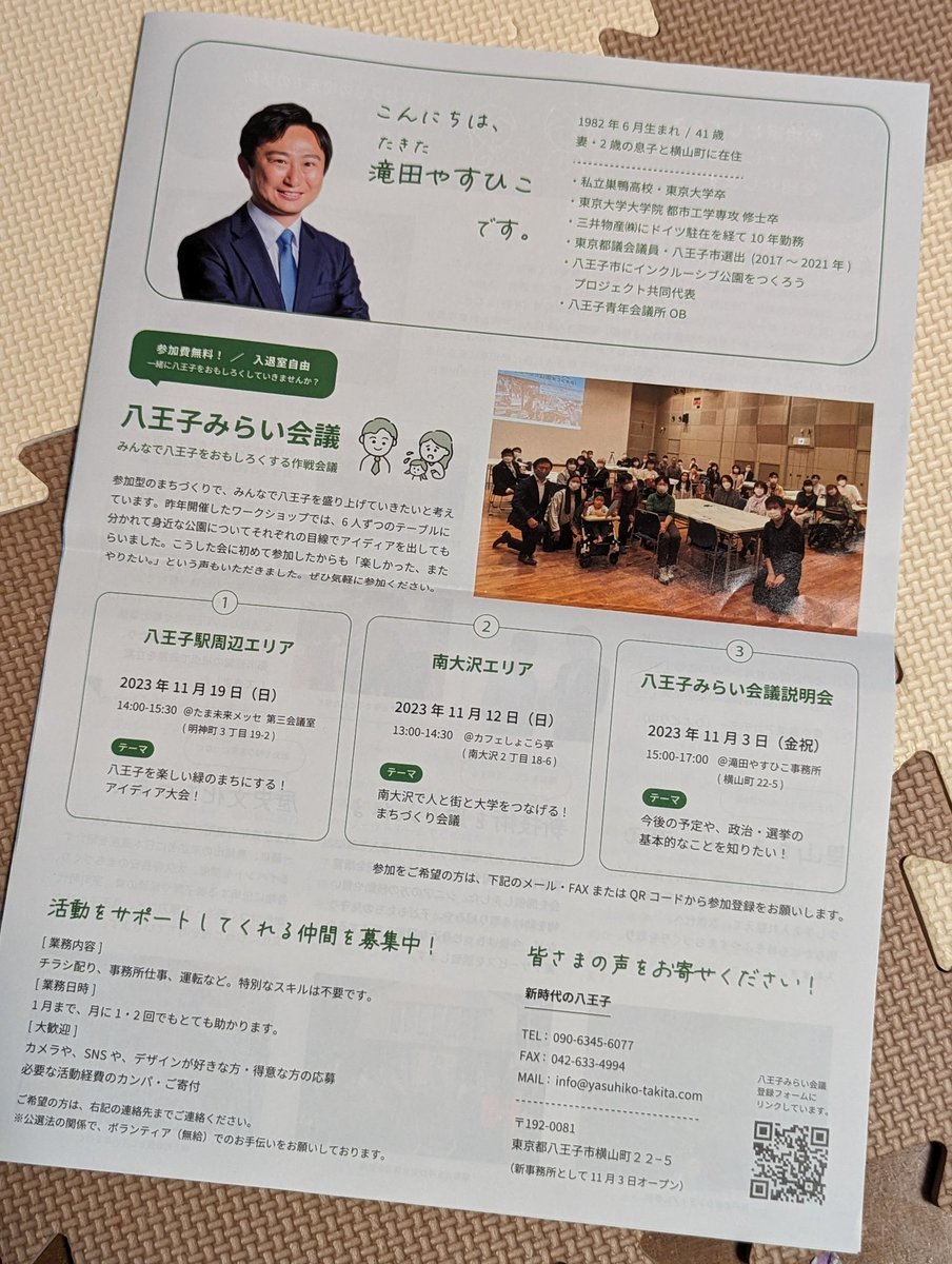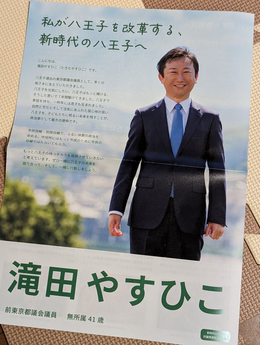 八王子市長選挙に向けて活動されている滝田やすひこさんの政策チラシを頂きました。滝田さんとは年齢も近く2歳の子どもの子育て中ということで親近感が湧きます。物腰が柔らかくいつも笑顔で、しかし芯の強さを感じさせるまさにリーダーといったお人柄です。ボランティア募集中だそうです。