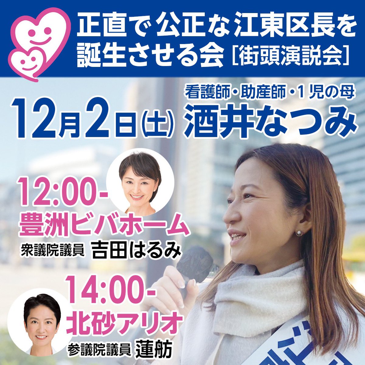 / 12/2・土 #酒井なつみ 街頭演説会 続々と応援弁士が駆けつけてくれます! \ 12:00〜 #吉田はるみ 衆議院議員@#豊洲 ビバホール 14:00〜 #蓮舫 参議院議員@#北砂 アリオ #古い政治ときっぱり決別 #江東区 #江東区長選挙