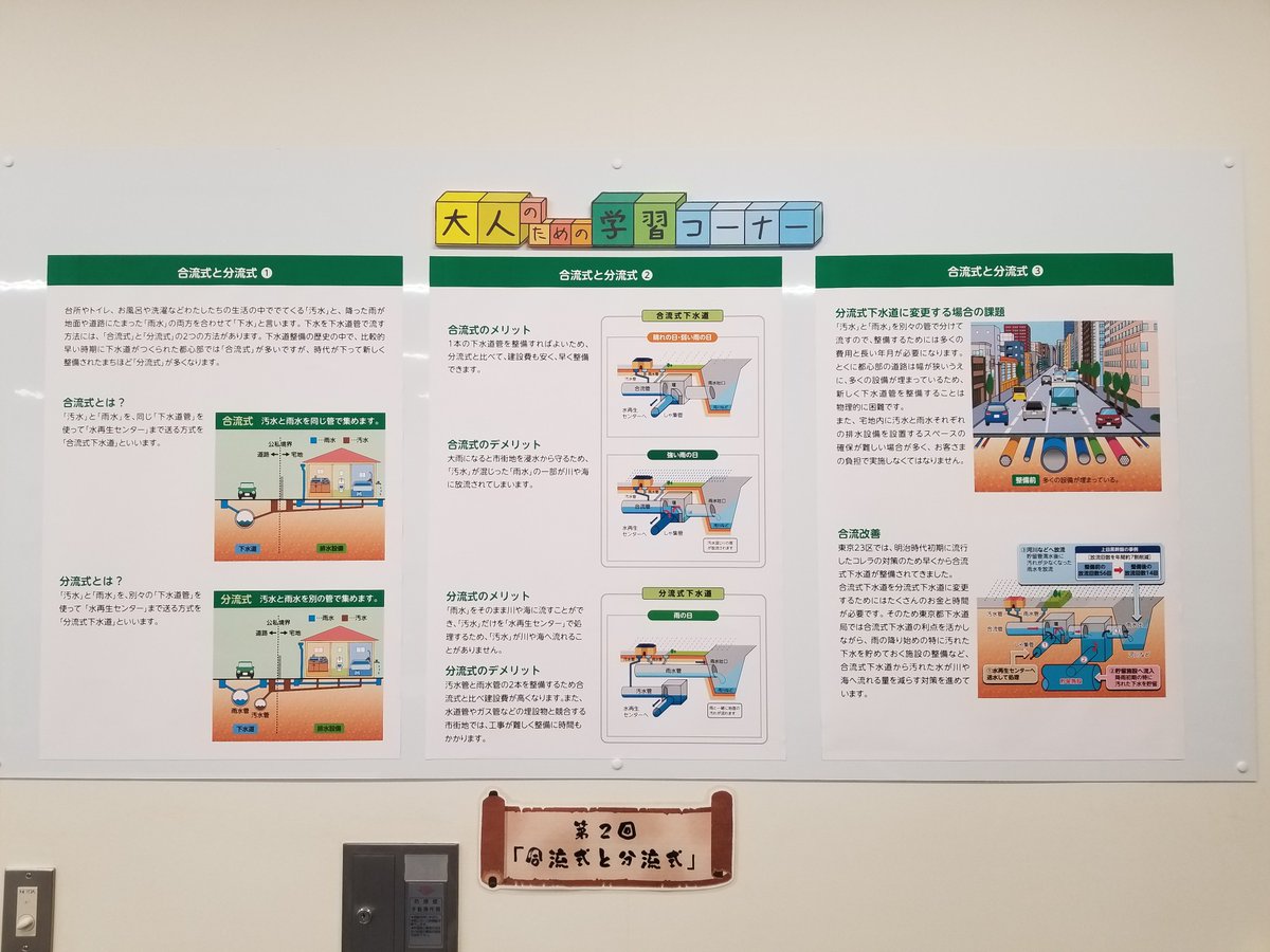 合流式下水道は、汚水と雨水を一つの下水道管で集め、分流式下水道は、汚水と雨水をそれぞれ別の下水道管で集める方式です。詳細は是非来館して確認してくださいね!