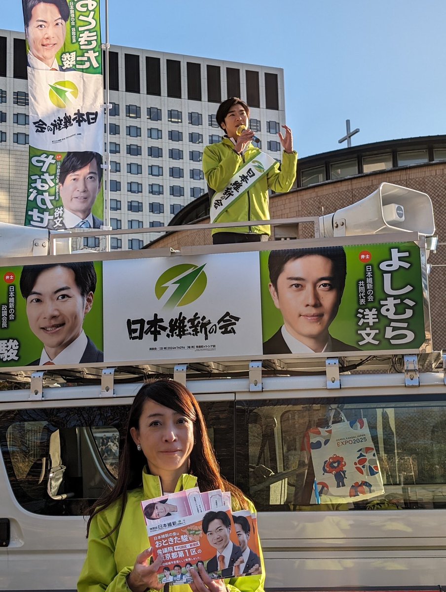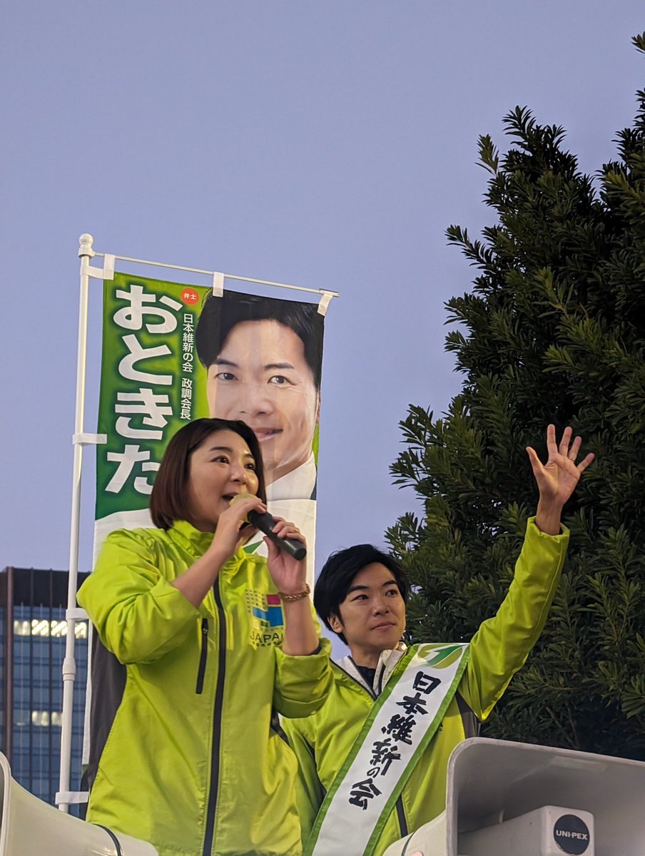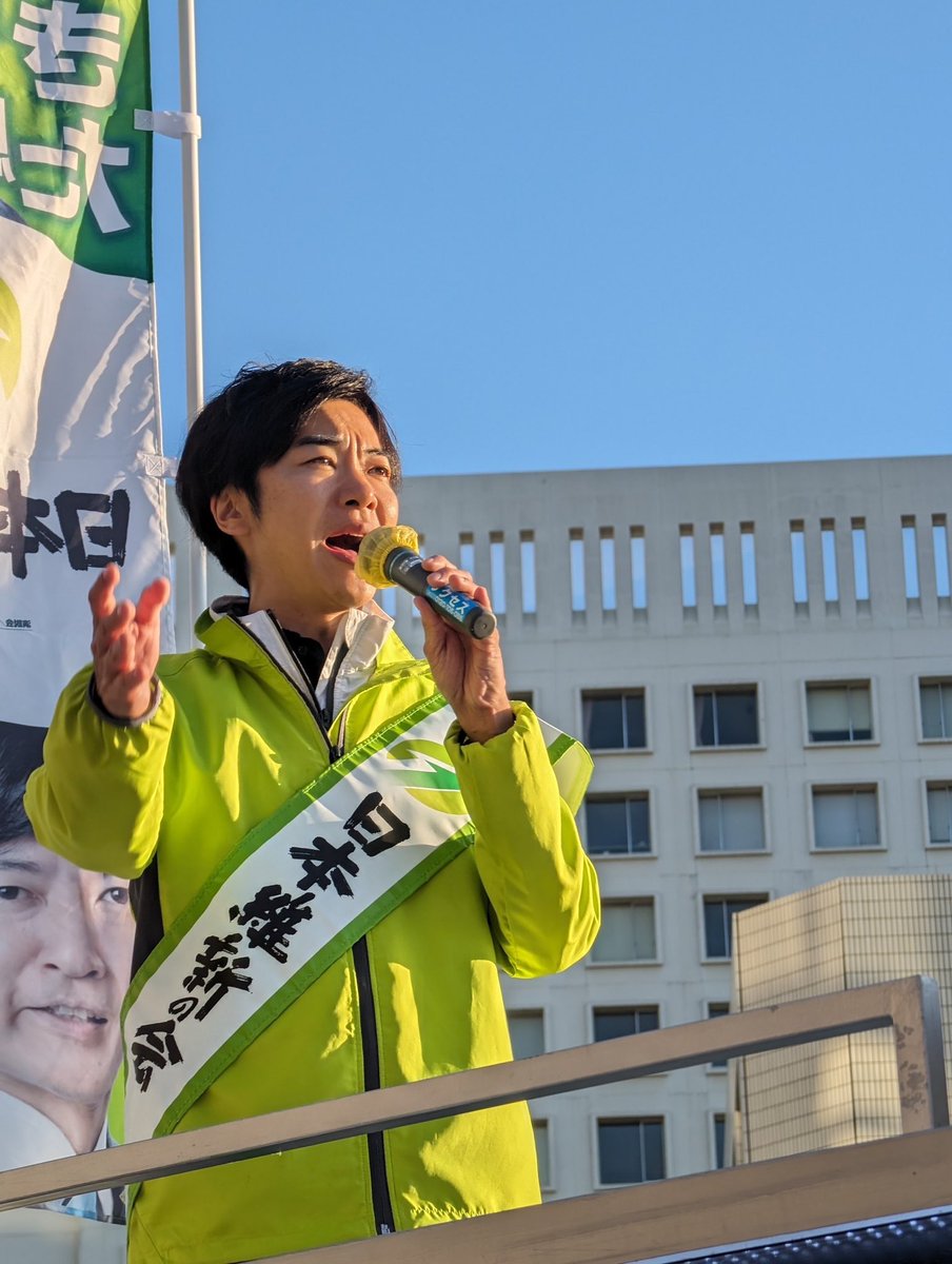ミニ集会後、春山あすか・おやまだ静香両区議と街宣。自民党議員に次々と組織的な裏金づくり疑惑が発覚。「政治とカネ」問題に決着をつけない限り、他の分野でも政策・改革は進まない。