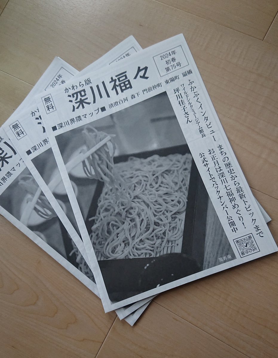 フリーペーパー「かわら版 深川福々」第75号(初春号)が発行となりました。 深川の店舗や大江戸線清澄白河駅改札内、深川東京モダン館など50ヶ所以上に配布、設置します。まち歩きにぴったりな深川界隈マップ付き。ぜひお持ち帰りください!
