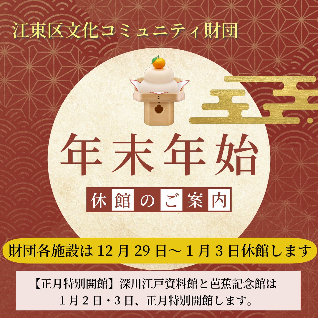 【#年末年始のご案内】 江東区文化コミュニティ財団各施設は12月29日から1月3日まで休館いたします。 ※深川江戸資料館と芭蕉記念館は1月2日と3日、お正月の特別開館をいたします。#深川江戸資料館 は #常設展示室、#芭蕉記念館 は #展示室 と #史跡展望庭園 のみオープンします。#江東区